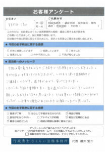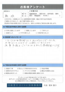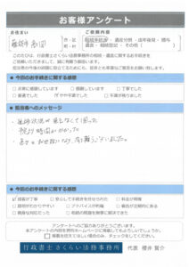 今回は葬儀会社からのご紹介で依頼させていただきました。本杉様に担当していただきましたが、LINEを使って定期的にご連絡をいただき、進捗がわかり安心できました。いただいた手続き書類を見て、自分達だけではここまでそろえるのは難しかっただろうと改めて思いました。行政書士に依頼するのは初めてでしたが、必要...